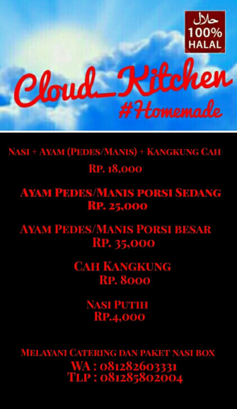 Home E-Katalog Kuliner CloudKitchen Claudya Ribkah Lasut KABUPATEN BANDUNG JAWA BARAT Whatsapp Cloud Kitchen bergerak dibidang katering,open order harian dan pesanan lainnya Lihat Profil Rp. Rp.18.000 Jln kavling manglid 28 kopo Sayati kab.bandung 081285802xxx [email protected] cloudKitchen Cloud_kitchen BAGIKAN