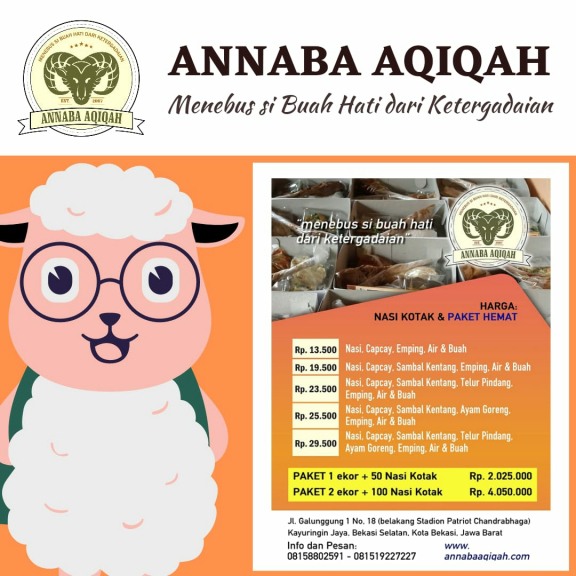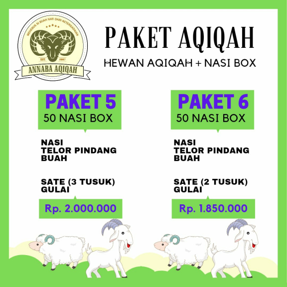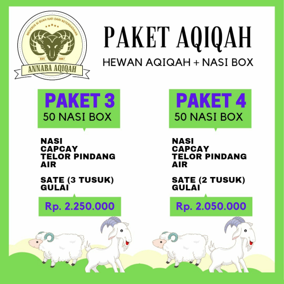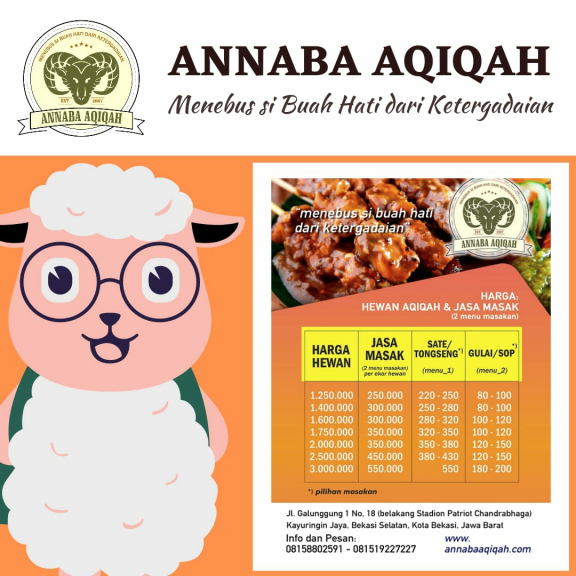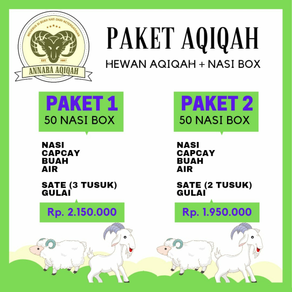 Annaba Aqiqah, melayani untuk pelaksanaan Aqiqah Ayah, Bunda, serta Putra dan Putri tercinta. Dengan pilihan Hewan Aqiqah diolah menjadi masakan Sate dan Gulai serta Menu Nasi Kotak. Annaba Aqiqah juga menyediakan Menu Paket Hemat 1 ekor plus 50 nasi kotak dan Paket Hemat 2 ekor plus 100 nasi kotak. Tersedia juga menu Paket yang lainnya.