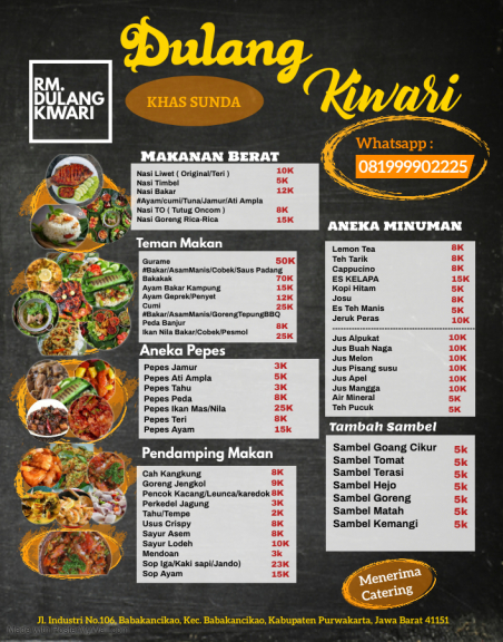 Home E-Katalog Kuliner RM.DULANG KIWARI Ega septiama KABUPATEN PURWAKARTA JAWA BARAT Whatsapp Rumah makan Khas sunda di Purwakarta Lihat Profil Rp. Rp.8.000 Jl industri kp tabrik 1 rt 011 rw 005 desa babakancikao kecamatan babakancikao kabupaten Purwakarta 41151 081999902xxx [email protected] https://m.facebook.com/ega.septiana.96?ref=bookmarks @egaseptiana9 BAGIKAN