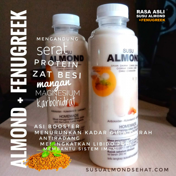 Rasa Asli Almond dan Kelabat/Fenugreek. ASI Booster. Susu Bernutrisi Tinggi. Bantu Sistem Imun, Libido, Diet, No Laktosa, No Kolesterol. Dari Kacang Almond Langsung. Alami Tanpa Pengawet.