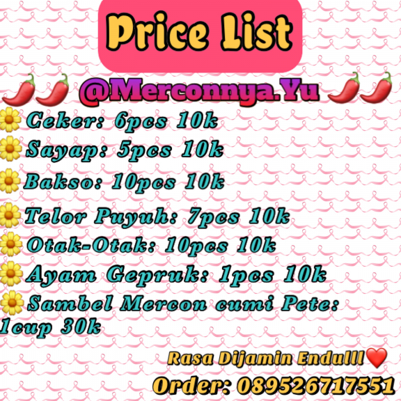 Home E-Katalog Kuliner Merconnya.yu Wahyu nur afni KOTA JAKARTA SELATAN DKI JAKARTA Whatsapp Makanan pedes yang enak dan murah Lihat Profil Rp. Rp.15.000 Jl. Amd x no.07 rt.009/rw.001 petukangan utara, pesanggrahan. Jakarta selatan 081286962xxx [email protected] @merconnya.yu BAGIKAN