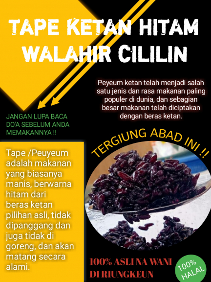 Tape ketan hitam manis khas cililin walahir terbuat dari beras ketan hitam pilihan yang di permentasi oleh ragi berkualitas tinggi, dan manis tanpa bahan pewarna dan pengawet