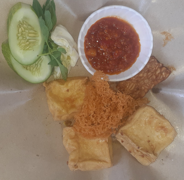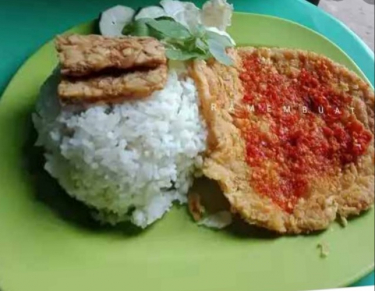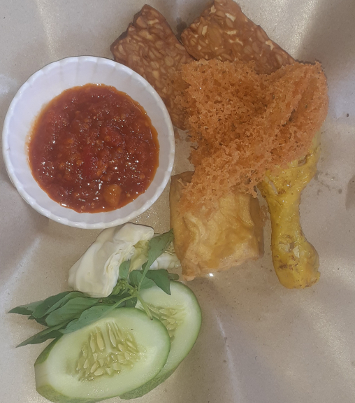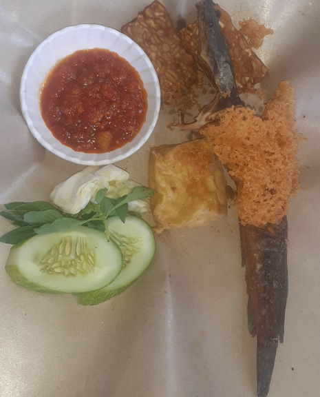 Nasi + aneka lauk pauk (ayam,lele,tahu,tempe,telur) + kremesan dengan sambel yang pedas + lalapan