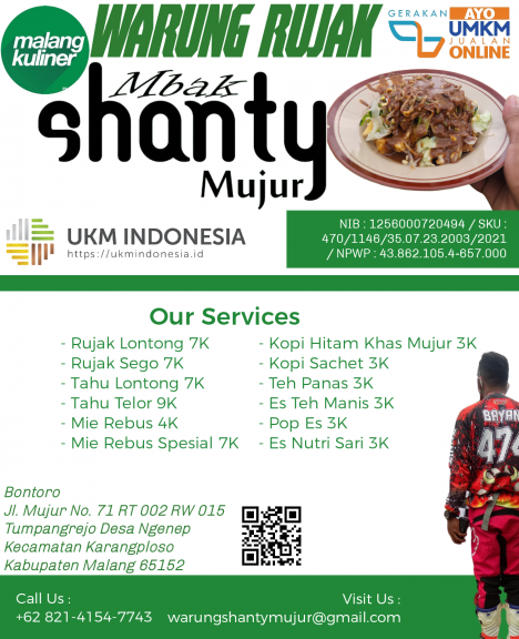 Home E-Katalog Kuliner Warung Rujak Mbak Shanty Mujur Aminatul Khoiriyah Susanti KABUPATEN MALANG JAWA TIMUR Whatsapp Makanan khas Indonesia Lihat Profil Rp. Rp.7 Jl. Mujur No. 71 RT 002 RW 015 Tumpangrejo Desa Ngenep Kecamatan Karangploso Kabupaten Malang 65152 082141547xxx [email protected] Shanty Bayan @misshanty.N625767nasa.mlg BAGIKAN