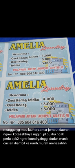 Home E-Katalog Jasa Loundry Siti Rahmawati Pertiwi KABUPATEN NGAWI JAWA TIMUR Whatsapp Antar jemput Loundry dari rumah ke rumah Lihat Profil Rp. Rp.4.000 Jln ronggowarsito gg anggrek rt 11 rw 05 ngadirejo Karangtengah ngawi jatim 085604616xxx [email protected] Tiwikpertiwi BAGIKAN