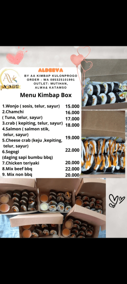 Home E-Katalog Kuliner Aldeeva sulfi nurfianti KABUPATEN KULON PROGO DI YOGYAKARTA Whatsapp Berbagai varian kimbap untuk setiap moment bahagia anda. Dikirim dari wates kulon progo hingga Se DIY dan purworejo Lihat Profil Rp. Rp.16.000 MUTIHAN NO.95 085325101xxx BAGIKAN