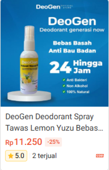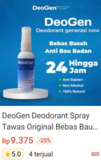 Home E-Katalog Kesehatan & Kecantikan DeoGen Ratna Hasriyanti KABUPATEN PEMALANG JAWA TENGAH Whatsapp deodorant dari tawas dengan berbagai bentuk untuk mengatasi bau Lihat Profil Rp. Rp.11.000 Kertosari rt 03 rw 02 Kec. Ulujami Kab. Pemalang 085226102xxx BAGIKAN