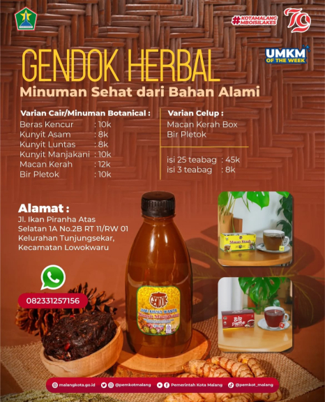 Home E-Katalog Kuliner Gendok Arik Maya Diana KOTA MALANG JAWA TIMUR Whatsapp Minuman kesehatan berbahan dasar rempah seperti jahe, kunyit, temulawak, dan sereh. Siap minum, aman dikonsumsi rutin, dan membantu menjaga daya tahan tubuh. Lihat Profil Rp. Rp.15.000 Jl. Ikan Piranha Atas Selatan Gg 1A, Tunjungsekar, Lowokwaru 082331257xxx BAGIKAN