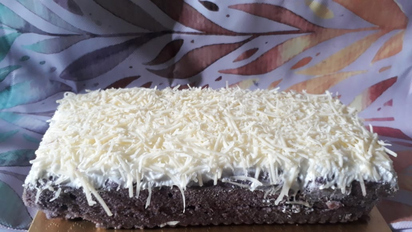 Bolu kukus rasa ubi unggu yang diatasnya diberi taburan keju panggang
