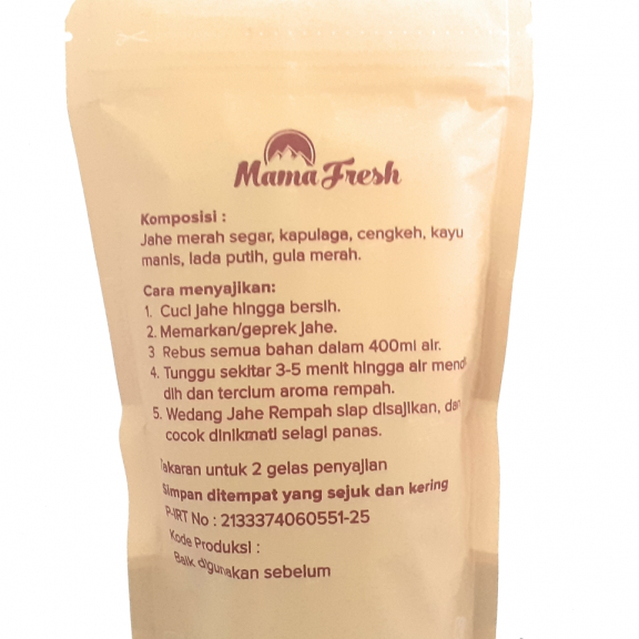 Jahe rempah dari Mama Fresh menggunakan 100p bahan alami dan tanpa bahan pengawet, selain itu bahan baku yang kami gunakan merupakan bahan - bahan pilihan dan kwalitas terbaik sehingga rasa yang dihasilkan sangat enak.