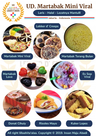 Home E-Katalog Kuliner Martabak Mini Viral Lekker d Creeps HERMAN KOTA JAKARTA UTARA DKI JAKARTA Whatsapp 1. Martabak Mini Viral 2. Lekker d&039; Creeps 3. Martabak Terang Bulan 4. Martabak Love 5. Es Sop Viral 6. Donat Cihuiy 7. Risoles Mayo 8. Kuker Lopes Lihat Profil Rp. Rp.2.000 Jl. Budi Mulia No. 143 RT. 8 RW. 12 Pademangan Barat, Jakarta Utara 14420 081535417xxx [email protected] BAGIKAN
