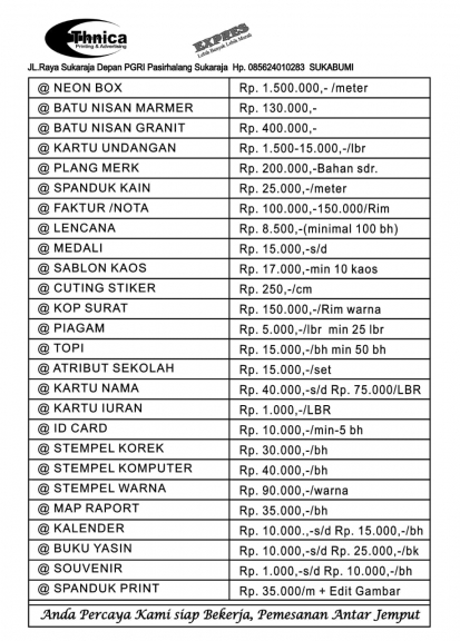 Home E-Katalog Jasa percetakan aan suhendar KOTA SUKABUMI JAWA BARAT Whatsapp menerima jasa percetakan Lihat Profil Rp. Rp.15.000 jl RA Kosasih Gg Juli Rt. 005/013 Kel. Cisarua Kec. Cikole Kota Sukabumi 085846138xxx [email protected] aansuhendar09 aansuhendar9 BAGIKAN