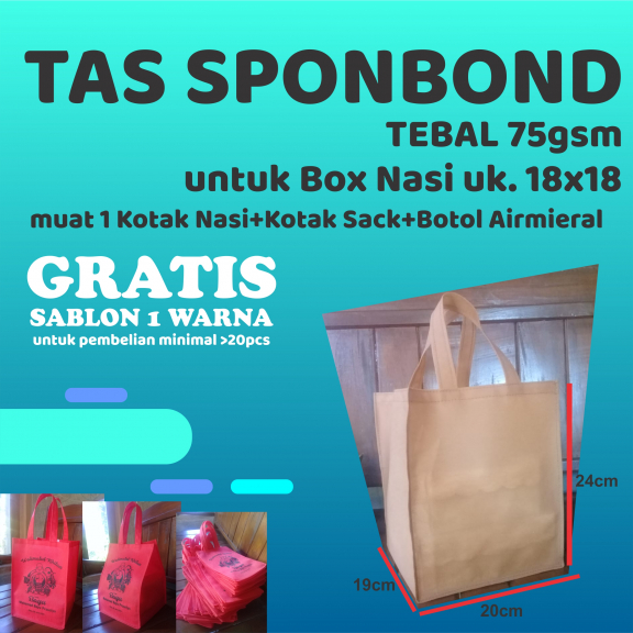Tas Box Nasi dan Kue untuk berbagai macam hajatan | Aqiqah | Walimah | Kenduri dll. -- Bahan Spunbond 75gsm{Tebal dan kuat} Jahitan Rapi Ukuran Tas 20x19x24cm {Muat 1 kotak Nasi Ukuran 18x18cm + Kotak Snack + Botol Air mieral} Perekat Di ujung Tas