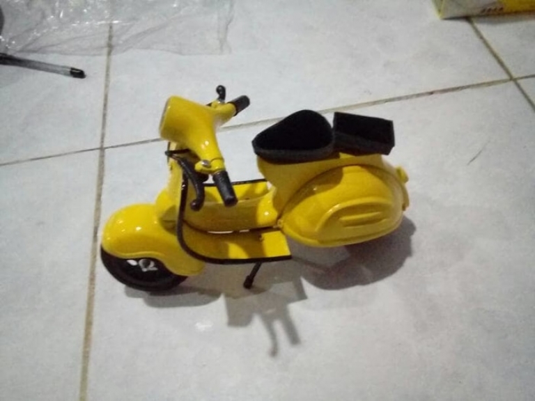 Miniatur Vespa warna kuning. terbuat dari bahan logam yang dibuat sedemikian rupa. sehingga terlihat unik dan cocok untuk dijadikan pajangan hadian ataupun souvenir acara. #tersedia warna lain : putih, hitam, merah, biru dongker, ijo telur asin, silver, natural.
