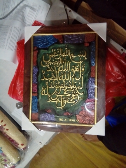 s Lukisan timbul Relief QS Al Ikhlash s Ukuran: +- 32 x 42 cm s Bahan : - Lukisan : lukisan timbul terbuat dari tanah liat bahan kramik yg dibentuk sedemikian rupa dan difinising dengan cat. - Bingkai : terbuat dari fiberglass dengan warna coklat