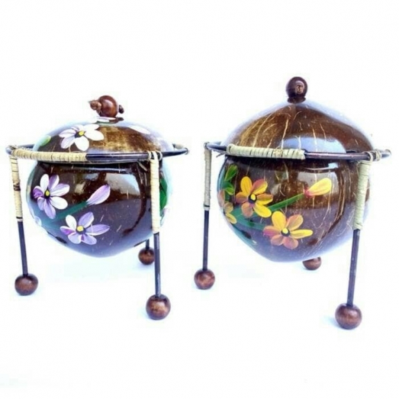 Bahan utama Dari Batok Kelapa. kemudian penyangga dan ring terbuat dari besi yang diikat dengan rotan. Ukuran produk : D 13cm dan T 12cm