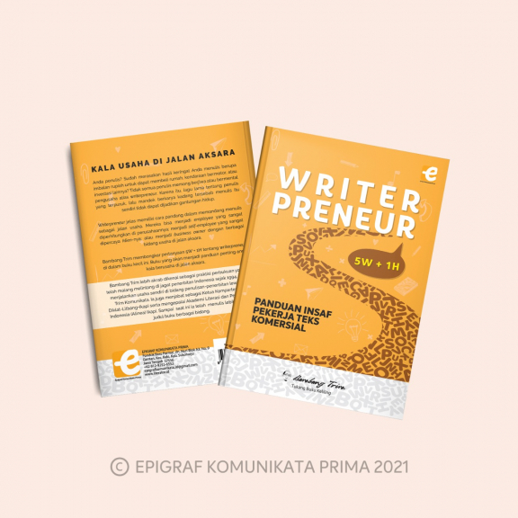 SPESIFIKASI Judul : Writerpreneur; Panduan Insaf Pekerja Teks Komersial Penulis : Bambang Trim Halaman : 144 hlm Ukuran : A5 (14,8 X 21) Kertas Isi : BP 55 gr (BW) Kertas Kover : AP 280 gr (FC) Kover : Soft Cover Jilid : Binding Lem Panas Harga : Rp100.000,00 ISBN : 978-623-92499-0-8 SINOPSIS Anda Penulis? Sudah merasakan hasil keringat Anda menulis, berupa imbalan rupiah untuk dapat membeli rumah, kendaraan bermotor, atau investasi lainnya? Tidak semua penulis memang berjiwa atau bermental pengusaha alias writerpreneur. Karena itu, lagu lama tentang penulis yang terpuruk, lalu mandek berkarya kadang tersebab menulis itu sendiri tidak dapat dijadikan gantungan hidup. Writerpreneur jelas memiliki cara pandang dalam memandang menulis sebagai jalan usaha. Mereka bisa menjadi employee yang sangat dipercaya kliennya; atau menjadi business owner dengan berbagai bidang usaha di jalan aksara. Dan buku ini akan menjadi panduan penting Anda kala berusaha di jalan Aksara.