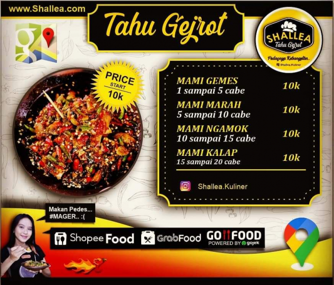 Tahu Gejrot Kekinian Campuran Tahu Sumedang + Kuah Aren yg Mantap.. bikin lidah tidak bisa berhenti untuk ingin terus melahapnya.. Dengan pilihan beberapa menu sambal dan yg pasti tidak bikin kantong bolong.. Berapapun cabai nya semua tetap serba 10.000,- Tahu Gejrot Shallea Pedasnya Kebangetan...