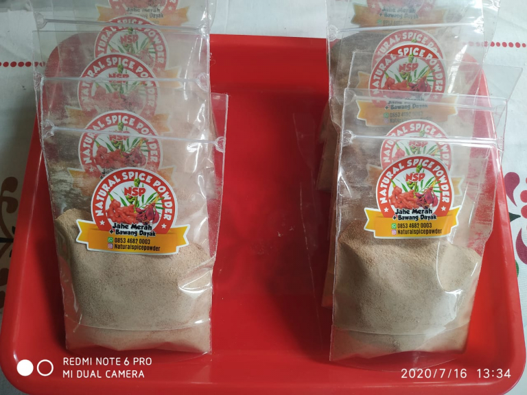 Terbuat dari bahan-bahan alami : Jahe Merah Bawang Dayak Rempah-Rempah Kemasan : 100 gr per pack