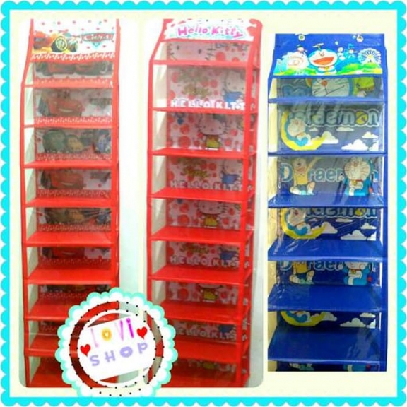 Rak Sepatu sl Rak gantung sepatusl Sandal (8 Tingkat) -Tempat untuk menyimpan Sepatu sl Sandal -Terdiri dari 8 sekat tempat Sepatu -Menjadikan Ruangan terlihat lebih Rapi Ready motif : sDoraemon : Biru sMickey mouse : Merah sHello Kitty : Ungu, Pink sSpiderman : --- sFrozen : Biru sKeropi : Hijau