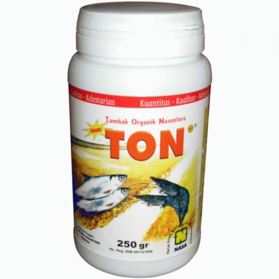TON merupakan formula khusus Tambak Organik yang diproduksi oleh PT Natural Nusantara. Formula alami (organik) khusus tambak perikananini untuk meningkatkan kuantitas dan kualitas produksi serta menjagaslmemperbaiki kelestarian lingkungan tambak dengan memberikan mineral-mineral yang dibutuhkan udangslbandeng, mempercepat pertumbuhan plankton sebagai pakan alami udangslbandeng, serta mengikat logam - logam berat sekaligus membantu mengurai senyawa komplek berbahaya beracun bagi udangslbandeng. TON (Tambak Organik Nusantara) juga membantu merutinkan molting udang.KEUNGGULAN :- Cukup signifikan sebagai pengganti pupuk Urea sl pupuk Kandang di tambak- Mempercepat pertumbuhan plankton (pakan alami ikan sl udang sl bandeng)- Membantu merutinkan molting udang- Mempercepat pertumbuhan ikan, udang & bandeng- Meningkatkan ketahanan terhadap penyakit- Membantu perkembangan mikroorganisme yang bermanfaat bagi lingkungan tambak dan bermanfaat bagi pertumbuhan ikan, udang dan bandeng- Menetralkan racun berbahaya seperti H2S, amoniak, asam laktat, dll dan mengikat logam-logam berat yang berbahayaCARA PAKAI :- Saat pengeringan tambak sl kolam, semprotkan 2,5 Kg TON- Sebelum penebaran benur sl bibit, tebarkan TON 250 gr sebanyak 10 botol ke tambak. Plankton akan tumbuh dalam 3 hari.- Selanjutnya untuk terapi budidaya, tebarkan TON ke tambak sebanyak 2 botol setiap 1 bulan sekali atau 1 sendok makan TON + air 10 liter siramkan ke kolam sl tambak.