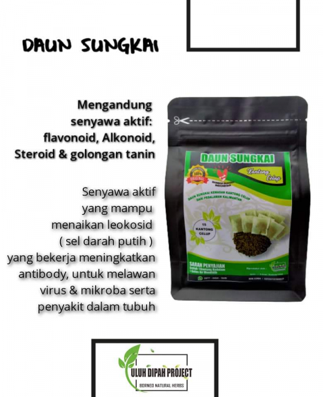 Teh daun sungkai kemasan teh celup siap seduh di olah dari daun sungkai segar yang di keringkan. Cukup di seduh dengan air panas, tunggu 5-10 menit lalu siap di konsumsi.
