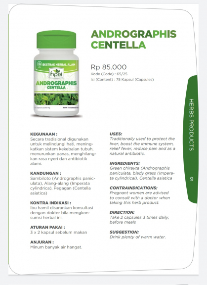 Andrographis Centella Andrographis Centella mengandung ekstrak sambiloto (andrographis paniculata), ekstrak ilalang (imperata cylindrica) dan ekstrak pegagan (centella asiatica). Andrographis Centella berperan sebagai pelindung lever (hepato-protector) terbaik. Bermanfaat meningkatkan sistem kekebalan tubuh, menurunkan panas (bersifat diuretik), analgesik alami (penghilang rasa nyeri) dan antibiotik alami. MANFAAT & KEGUNAAN : SAMBILOTO (Andrographis Paniculata): Untuk mengatasi/mengobati typhus abdominalis, disentri basiler (diare), flu, sakit kepala, panas, influenza, radang paru, radang saluran nafas, TBC paru, batuk rejan, darah tinggi, infeksi mulut, tonsilitis, pharyngitis, kencing manis, kudis, disentri, kencing nanah, kanker, demam, infeksi telinga tengah (OMA), luka bakar, digigit ular berbisa, membangkitkan nafsu makan. KHASIAT ILALANG (Imperata Cylindrica): Untuk mengatasi/mengobati muntah darah, mimisan, air kemih berdarah, kencing nanah, hepatitis, radang ginjal, rasa haus pada campak. KHASIAT PEGAGAN (Cantella Asiatica): Untuk mengatasi/mengobati infeksi saluran kencing, bisul, panas, ayan, busung, pembengkakan hati, campak, darah tinggi, wasir, typhus, lepra, batuk darah, muntah darah, batuk asthma, batuk kering, demam, radang amandel, sakit tenggorokan, bronchitis, sakit kepala, sakit perut, cacingan, menambah nafsu makan, mata merah, bengkak. Rp 85.000 Kode : 65/25 Isi : 75 kapsul