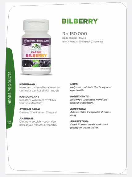 Bilberry Bilberry mengandung antosianosid (salah satu bentuk flavonoid) dan polifenol sebagai antioksidan antioksidan yang dapat meningkatkan mikrosirkulasi dan menjaga fungsi retina. Senyawa tersebut berkhasiat untuk melancarkan aliran darah pada retina mata; juga diindikasikan pada penderita degenerasi makula, katarak, retinopati diabetik dan meningkatkan daya penglihatan di malam hari. MANFAAT & KEGUNAAN : Buah Bilberry telah digunakan sejak abad ke-16 di Eropa sebagai obat tradisional untuk mengatasi gangguan pembuluh darah dan penyakit mata karena mengandung zat aktif yang disebut antosianosida. Zat ini mampu membangun kapiler kuat yang terdapat di sebagian besar pembuluh darah mata sehingga meningkatkan aliran darah dan pengiriman oksigen ke dalam kapiler. Peningkatan aliran darah ke mata dapat mencegah hipertensi okular yang dapat mengurangi resiko glaukoma. Bilberry membantu menghentikan penyebaran degenerasi makula akibat kerusakan retina yang dialami orang berusia lebih dari 50 tahun. Bilberry juga terbukti dapat mencegah katarak, penglihatan buram dan rabun senja karena adanya kandungan flavanoids yang membangun kolagen dalam pembuluh darah mata dan melindungi penglihatan serta daerah sensitif di sekitar retina. Setelah diteliti, Bilberry dapat untuk mengobati gejala diare, meningkatkan aliran darah, memperkuat gigi, memperkuat kulit dari iritasi dan infeksi, serta menyembuhkan gangguan lambung/ gastointestinal. Rp 150.000 Kode : 110/42 Isi : 50 kapsul