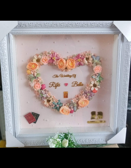 Mahar pernikahan untuk mengabadikan moment pernikahan, ukuran luar kurang lebih 40x40 cm bahan figura fiber, isi campuran bunga artifisial, akrilik