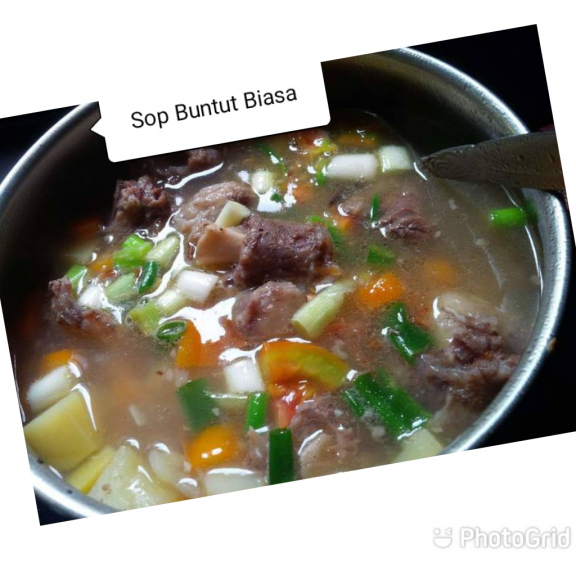 Buntut sapi diolah dengan rempah dengan isian kentang, wortel, daun bawang seledri, tomat, bawang goreng dan disajikan dengan perasan jeruk limo, sambel dan emping