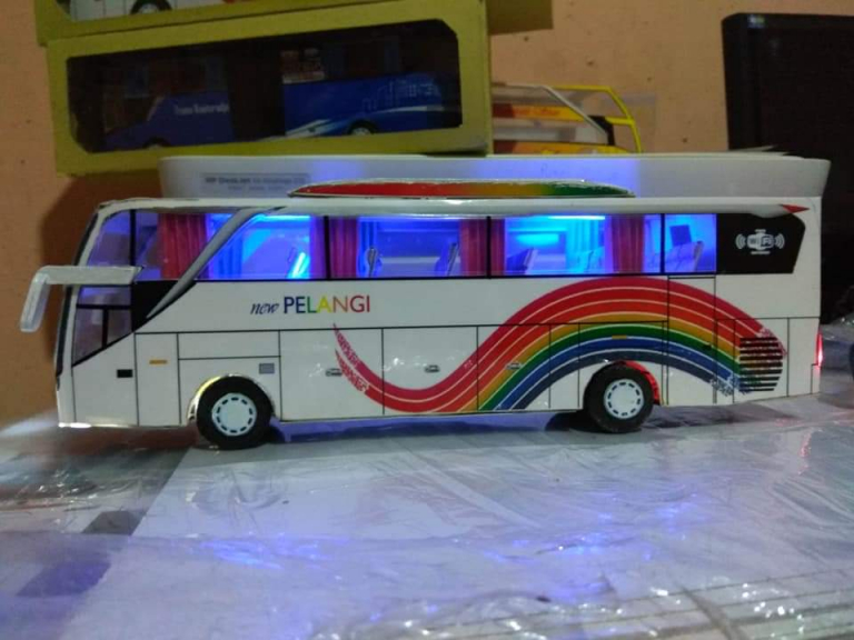 Miniatur bus skala 1:30 terbuat dari plastik mika anti air, kilat, lampu led