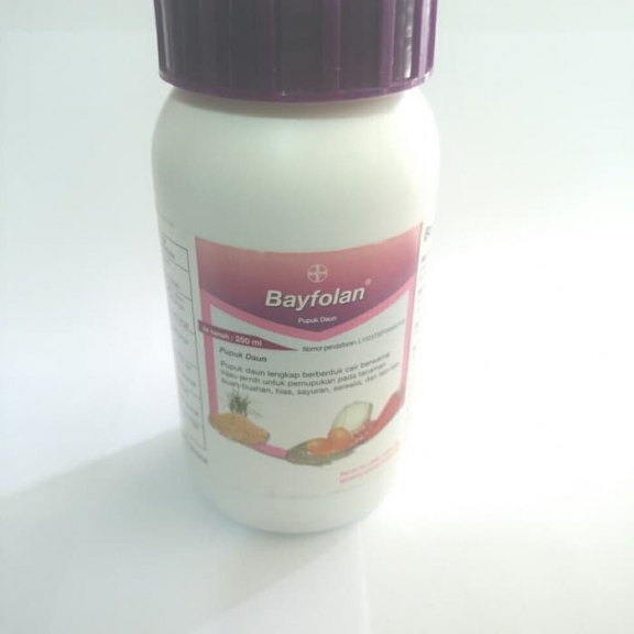 Pupuk daun bayfolan adalah pupuk cair dengan kandungan nutrisi lengkap NPK (11-8-6) yang dapat memacu pembentukan batang + daun serta membantupertumbuhan tanaman pada fase vegetatif maupun pada fase pemulihan setelah fase generatif. Pupuk daun bayfolan juga mengandung unsur mikro pelengkap yang berguna (Fe, Mn, Mo, B, Cu, Zn dan Mg) sehingga dapat dipakai untuk mengatasi gejala defisiensi pada tanaman Cara aplikasi : disemprotkan ke daun Dosis umum : 2 mlslliter air, diaplikasikan pada pagi hari Untuk mengatasi gejala defisiensi, aplikasi dilakukan sampai gejala hilang Berat bersih: 250ml