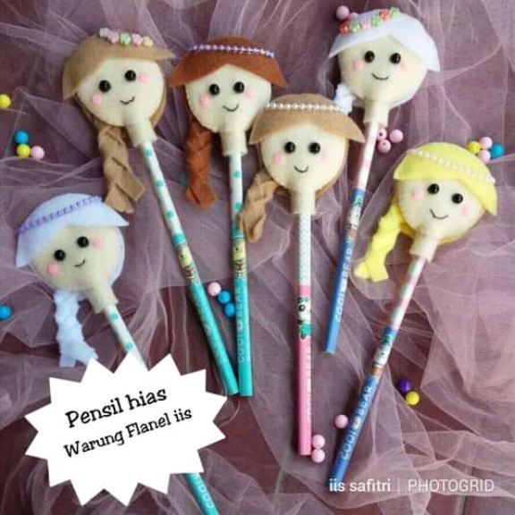 Pensil dengan hiasan boneka dari kain flanel ini lucu banget lo.. bisa dilepas jika pensil sudah habis