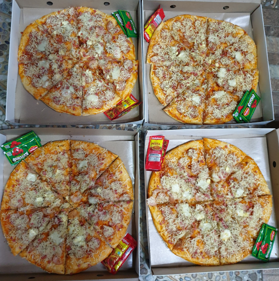 Pizza dengan topping lengkap, daging, sosis, mozzarella, cheddar, edam, dan cream cheese
