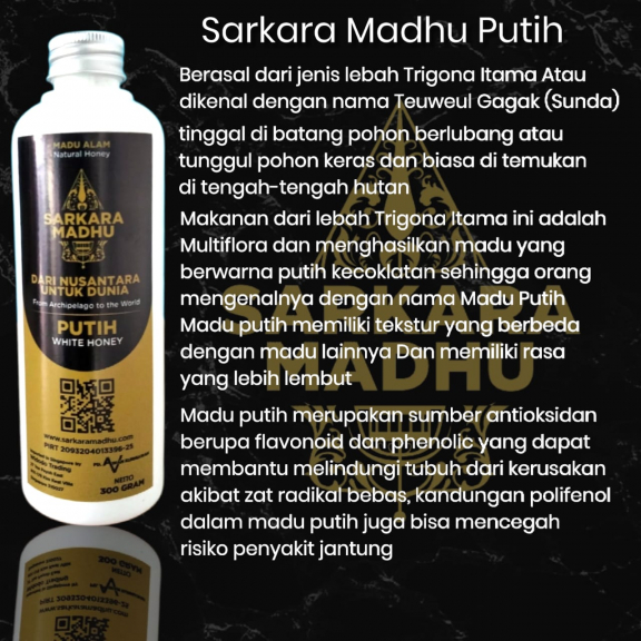 Berasal dari jenis lebah Trigona Itama, dimana lebah tersebut tidak memiliki sengat. Di alam bebas, biasanya mereka tinggal di batang pohon berlubang atau tunggul pohon keras. Mereka biasa di temukan di tengah-tengah hutan. Makanan dari lebah Trigona Itama ini adalah Multiflora dan menghasilkan madu yang berwarna putih kecoklatan, sehingga orang mengenalnya dengan nama Madu Putih Madu putih memiliki tekstur yang berbeda dengan madu lainnya, madu yang satu ini memiliki rasa yang lebih lembut