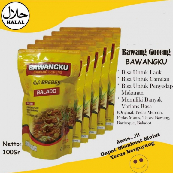 Tersedia dalam varian: - Original - Pedas mercon - Pedas manis - Terasi bawang - Barbeque - Balado Bawang goreng crispy khas brebes. di oleh dengan bahan yang berkualitas sehingga menciptakan rasa dan aroma khas bawang brebes. Masa penyimpanan: 7 bulan