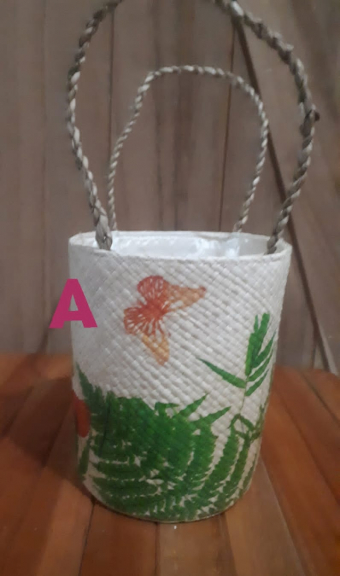 Wadah hampers/hantaran Material: anyaman pandan + tutup kain serut Size: diameter 18 cm, T. 39 cm ( tanpa tutup muat 3 toples kue kering ukuran sedang)