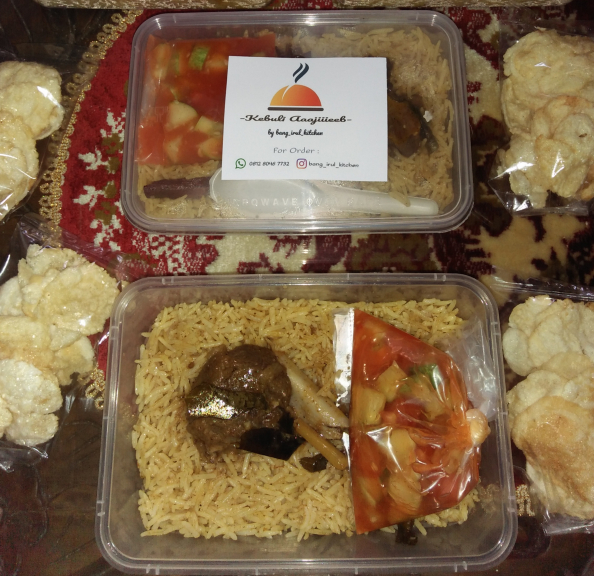 Seporsi Nasi Kebuli dengan 1 potong ayam rempah dan Acar. Note : Minimum Order 5 pcs. Promo : Order 10 pcs Gratis 1 pcs