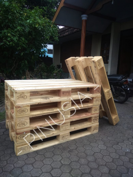 Pallet kayu pinus impor dengan dimensi panjang x lebar x tinggi : 120 cm x 80 cm x 14,4 cm