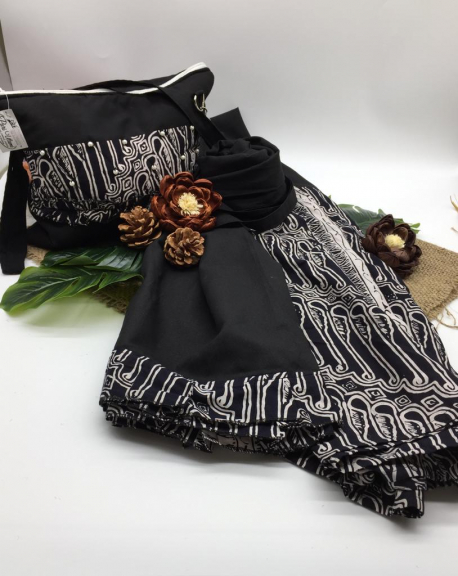 Mukena Puriutami dibuat memakai bahan batik garutan khas Jawa Barat dengan mengkombinasikan bahan katun polos ima warna hitam. Ditambah tas mukena dengan bahan yang sama.