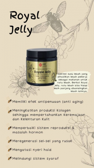 Susu lebah murni yang sangat tinggi collagen. Sebagai anti aging, melindungi sistem syaraf, membantu regenerasi sel, membantu mempercepat penyembuhan dll