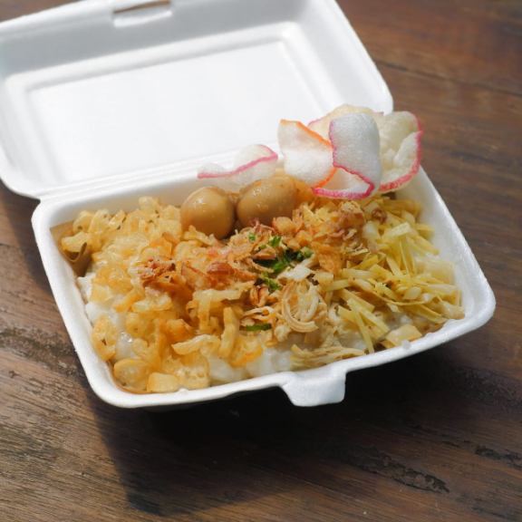 Bubur Ayam Super Spesial dengan Kuah Kuning khas Dan Topping Lengkap yaitu Ayam Suwir, Telur Puyuh, Cakwe, Keripik Pangsit, Bawang Goreng Dan Seledri