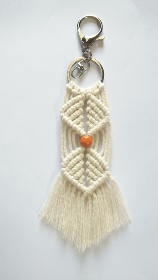 Gantungan kunci macrame pola fishbone ini sangat cocok dijadikan aksesoris tas kamu, bisa juga dijadikan gantungan kunci rumah, motor, mobil dan lainnya Bahan: tali katun Warna: broken white Ukuran: pxl (17x4) Warna wooden beads nya bisa berubah ya~ sesuai stok yang tersedia