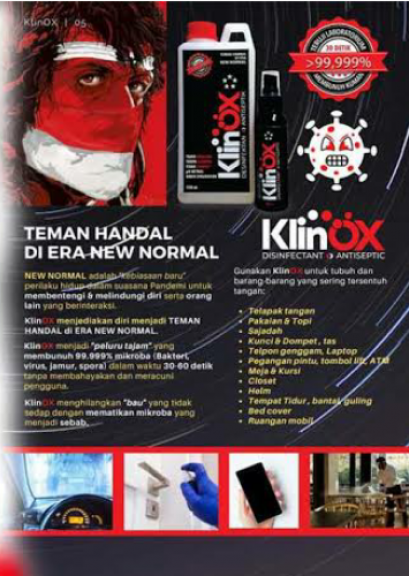 KlinOX adalah solusi oksidasi tingkat lanjut yang diproduksi oleh teknologi elektrolisis khusus untuk antiseptik,disinfektan, sterilisasi, pembersih untuk semua permukaan termasuk cuci tangan.
