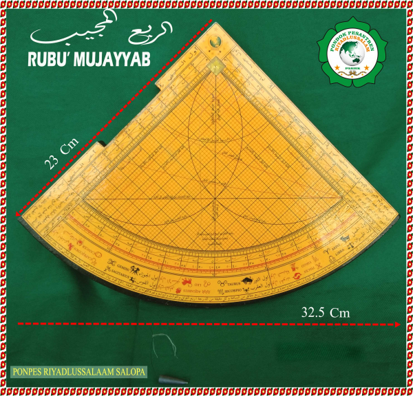 Rubu’ Mujayyab sebagai alat astronomi hasil eksperimen para astronom, dalam perkembangannya dikenal setelah astrolabe yang digunakan untuk mengukur ketinggian Benda langit, menghitung jarak sekaligus memprediksi arah atau koodinat. Alat ini terbuat sari bahan kayu berumur tua. SPESIFIKASI: Nama : Rubu’ Mujayyad Bahan : - Kayu Berumur Tua - Plat kuning Sirlak Berkualitas Dimensi : - Rubu’ 23.5x23.5 cm - Tebal 2.5 Cm Aksesoris : Benang dan pendulum 25 gr dengan Dua QAOS &039;Asar 1. Qaos Asar Awal menurut imam Syafi,i, Malik dan Ahmad. 2. Qaos Asar Stani Menurut Abi Hanifah Dairah Mail A&039;dzhom 24 drajt seperti dalam kitab taqqribul maqso