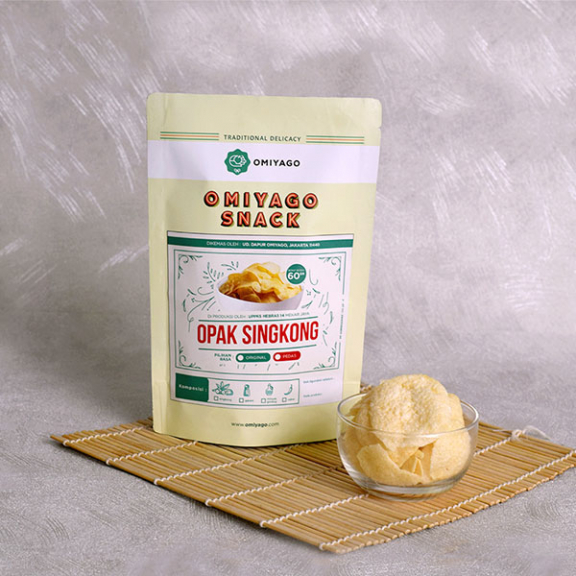 Opak Singkong Original Omiyago Opak singkong Omiyago terbuat dari singkong pilihan dengan proses yang terjaga, menggunakan bahan-bahan tambahan kualitas premium yang dipilih oleh ahli makanan. Digoreng dengan minyak ber-omega dengan suhu yang pas sehingga menghasilkan opak dengan kerenyahan yang sempurna. Selain tidak berminyak, opak Omiyago juga tanpa menggunakan pengawet atau bahan kimia tambahan lainnya sehingga menikmati camilan ini tanpa perlu khawatir. Dikemas dalam kemasan eksklusif sehingga bentuk dan kerenyahan opak terjaga hingga produk sampai ke tangan Anda. Opak Omiyago dibuat dalam dua varian rasa yaitu original yang memiliki rasa gurih dan pedas dengan taburan bubuk cabai asli yang siap meledak di mulut Anda. Opak singkong Omiyago diproduksi oleh UKM mitra dengan pengawasan dan quality control dari Omiyago sehingga kualitas opak terjamin, dengan membeli produk dengan label Omiyago, Anda turut membantu pertumbuhan ekonomi keluarga mitra kami. Bahan Dasar Singkong, Minyak Goreng dan Garam