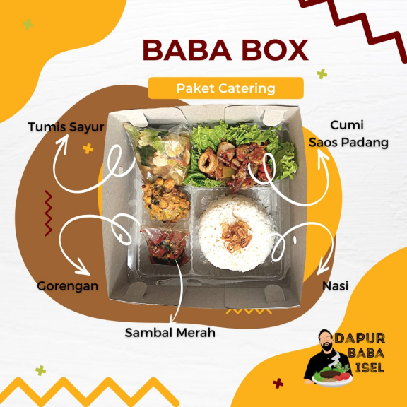 Dapur Baba Isel, menyediakan aneka masakan rumah untuk catering harian/ bulanan, catering karyawan, tasyakuran, aqiqah, acara kantor, ulang tahun dan lainnya Kami siap membantu menyukseskan acara anda dengan menyediakan masakan enak, berkualitas, higienis dan murah Paket Catering - Baba Box sNasi Putih sSayur (Bisa Request) sAyam/ Ikan (Bisa request cara masak) sGorengan (Tahu/Tempe/Bakwan/Martabak) sSambal (Kemangi/ijo/Merah/Matah/Dabu) sBuah Untuk request pilihan menu bisa chat admin Jika ada budget khusus, menu bisa disesuaikan, silahkan chat admin Pengiriman wajib menggunakan Instant Kurir (bukan sameday) Outlet offline ada di Cipinang - Jakarta Timur Min. 25 box dapat free kartu nama acara/ kegiatan untuk promo dan info lainnya bisa cek di IG @dapurbabaisel
