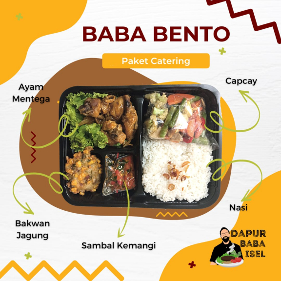 Dapur Baba Isel, menyediakan aneka masakan rumah untuk catering harian/ bulanan, catering karyawan, tasyakuran, aqiqah, acara kantor, ulang tahun dan lainnya Kami siap membantu menyukseskan acara anda dengan menyediakan masakan enak, berkualitas, higienis dan murah Paket Catering - Baba Bento sNasi Putih sSayur (Bisa Request) sAyam/ Ikan (Bisa request cara masak) sGorengan (Tahu/Tempe/Bakwan/Martabak) sSambal (Kemangi/ijo/Merah/Matah/Dabu) sBuah Untuk request pilihan menu bisa chat admin Jika ada budget khusus, menu bisa disesuaikan, silahkan chat admin Pengiriman wajib menggunakan Instant Kurir (bukan sameday) Outlet offline ada di Cipinang - Jakarta Timur Min. 25 box dapat free kartu nama acara/ kegiatan untuk promo dan info lainnya bisa cek di IG @dapurbabaisel