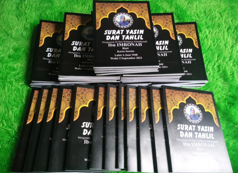 Buku yasin custom, bisa menggunakan foto tanpa biaya tambahan. Isi 96, 128, 144 dll Bisa langsung paket souvenir