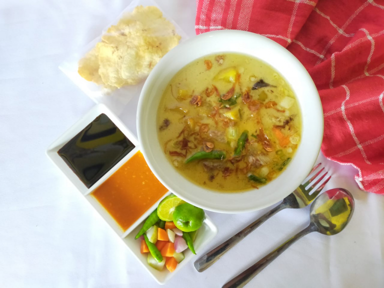 Isi soto Betawi dapur Ukhtiya Daging campur, kentang, tomat, daun bawang seledri, di sajikan dengan kuah susu, di tabur bawang goreng, emping, acar, sambel,